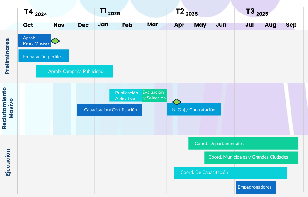 Objetivo: apoyar el fortalecimiento de la UEP-INE en todos los aspectos relacionados a la ejecución de pagos de inicio a fin del proceso de reclutamiento sea masivo o no, que será requerido para el proyecto, dentro de los plazos y presupuestos definidos del operativo del Censo Nacional de Población y Vivienda (CNPV).